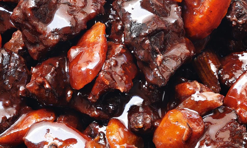 Chauffer le four à 150°C. Égoutter les viandes et la garniture séparément. Filtrer la marinade directement dans une passoire posée sur une casserole. Faire bouillir le vin de la marinade pendant 2 minutes en l’écumant soigneusement.