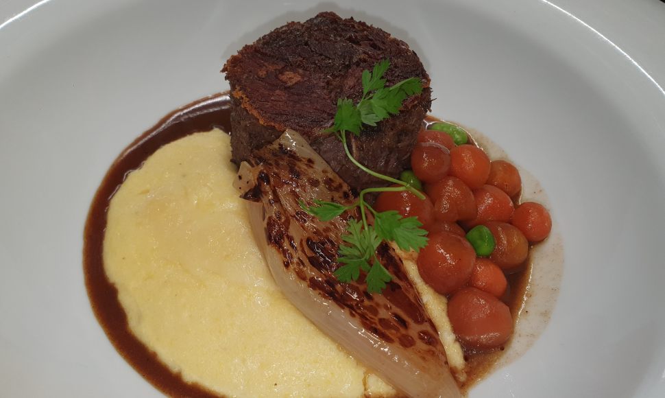 Couper des palets de joue de bœuf, les saisir dans une poêle chaude avec un filet d’huile. Dans une autre poêle faire caraméliser les endives et glacer les carottes dans une noix de beurre. Réchauffer le jus et la polenta avec une pointe d’eau puis dresser