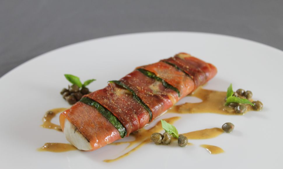 Sous cet habillage de jambon cru légèrement croustillant se trouve un filet de daurade fondant à la chair très parfumée. Vous pouvez accompagner votre poisson de légumes ou de féculents qui se marient également à la sauce tonnato.