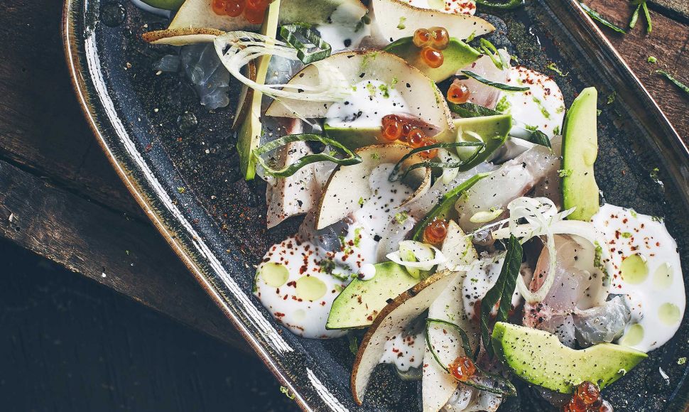 Intercalez des lamelles de daurade marinées et les fines tranches de poire dans les assiettes. Arrosez de la marinade au lait de coco et d’huile de persil. Parsemez d’œufs de poisson et d’oignon nouveau émincé. Salez et poivrez.