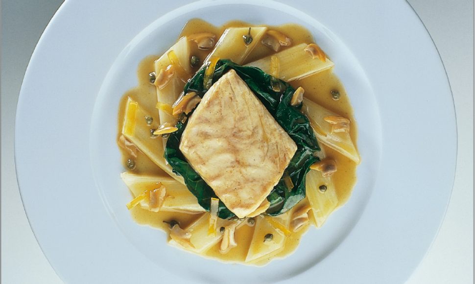 Daurade en épais filet suc citronné, côtes et verts de blette