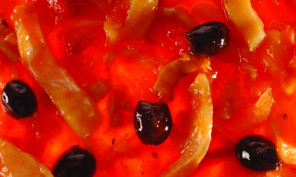 Brûler les poivrons sur la braise jusqu’à ce que la peau noircisse. Les peler. Retirer le pédoncule et les pépins. Couper la pulpe en lanières de 5 mm de large sur 5 cm de long.