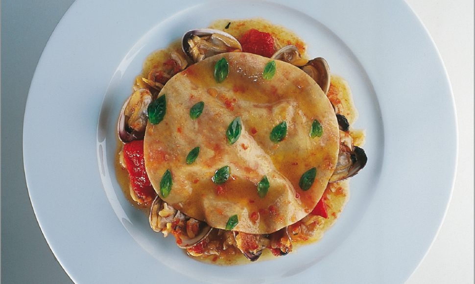 Des pâtes géantes à la tomate confite et aux vongole, un jus citronné