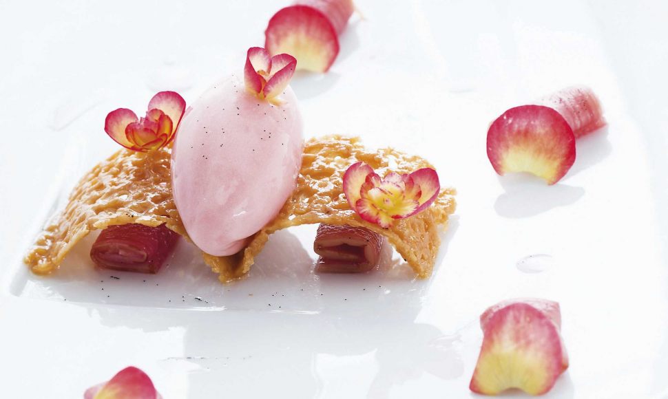 La rhubarbe est-elle une plante comestible ou une plante d'agrément ? Difficile à dire quand on voit ses immenses feuilles se déployer dans les jardins. Alors, le pâtissier a choisi de ne pas choisir : il la propose en dessert, entourée de fleurs.