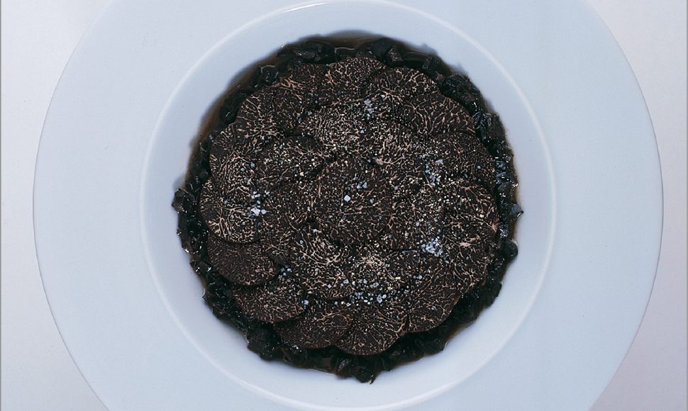 Des truffes noires en marmelade cassée, d’autres en fines lamelles, pommes de terre, fleur de sel