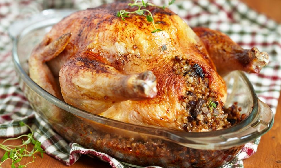 Farcir la dinde en veillant à bien tasser la farce jusque dans le fond.