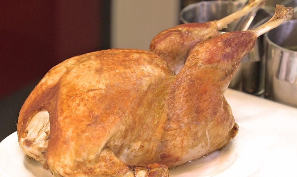 Soulever entièrement la peau du cou afin de dégager et retirer le bréchet : passer la lame du couteau derrière celui-ci, remonter jusqu’à la jointure des deux os, le dégager puis le retirer en le faisant tourner sur lui-même. Bien remettre la peau en place afin de fermer l’orifice du cou. (On peut demander au boucher d’effectuer ces opérations). Retirer aussi les amas de graisse qui se trouvent dans l’autre orifice. Mettre la dinde dans une plaque et la réserver au réfrigérateur.