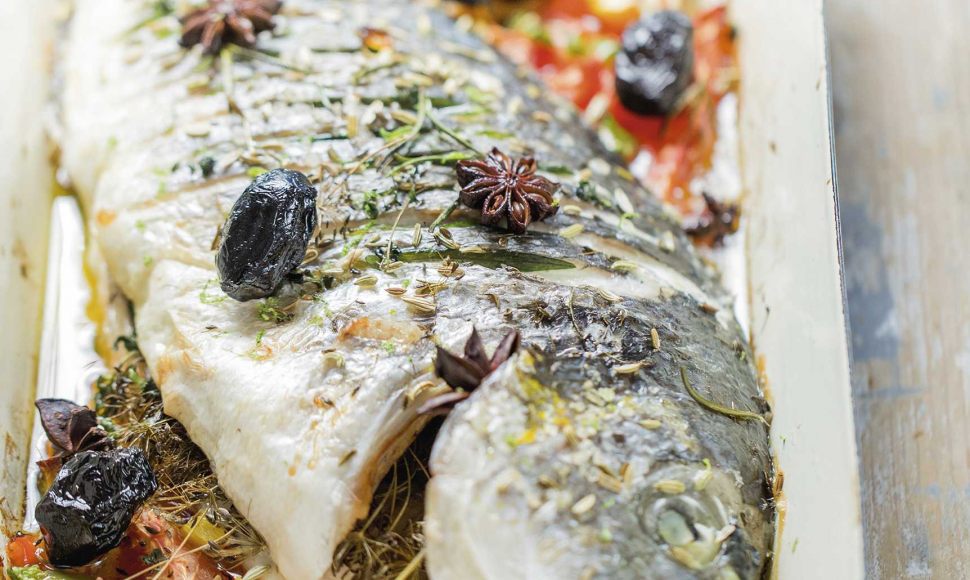 Dorade cuite au four feuilles de kéfir, olives de volos, tomates, artichauts, basilic