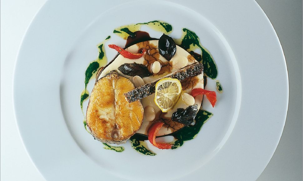 Dos de daurade royale au plat, ventre croustillant enrobé de poivre concassé, purée de cocos vinaigrée, chair de tomate aux lamelles de citron et basilic opale