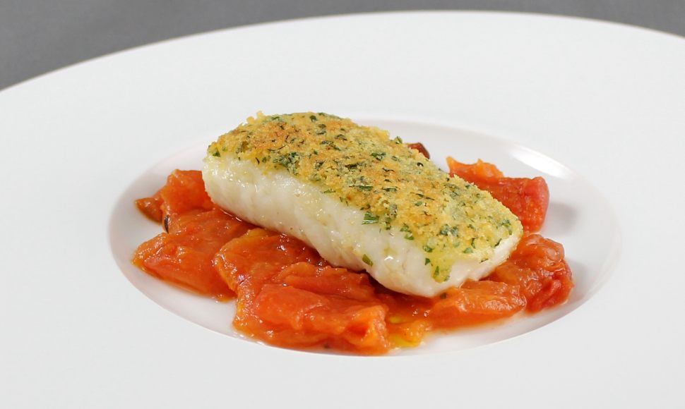 Dos de merlu piqué d'ail, doré aux herbes fraîches, fondue de tomate