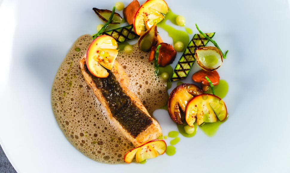 Dos de Saint-Pierre cuit sur l'arête, jus d'oignon, huile de tagète