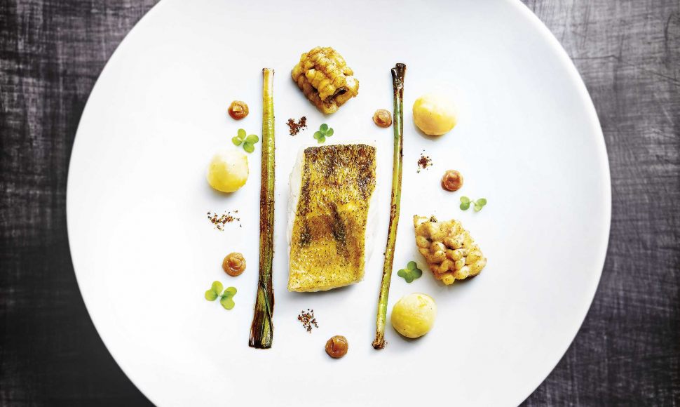 Dos de sandre de pays saisi, anguille fumée aux sarments de vigne, soupe de pomme de terre grillée au genièvre