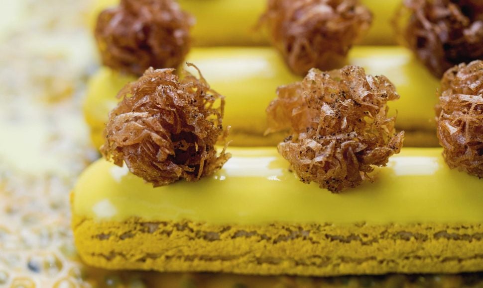 Le jour même, réalisez les éclairs en suivant cette recette avec un crumble jaune et faites-les cuire 20 min à 180 °C (th. 6). Laissez sécher à 160 °C (th. 5-6) pendant 15 min. Réalisez également le glaçage jaune et les boules de gavotte comme indiqué p. 319.