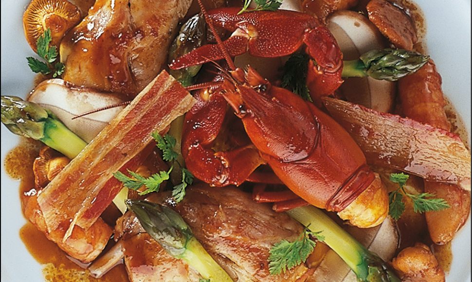 Ecrevisses « pattes rouges », avants de lapin et asperges vertes mijotés ensemble