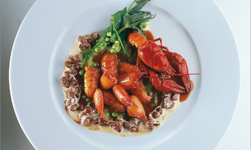 Ecrevisses « pattes rouges » sautées aux mousserons des prés et petits pois, jus de cuisson à peine crémé