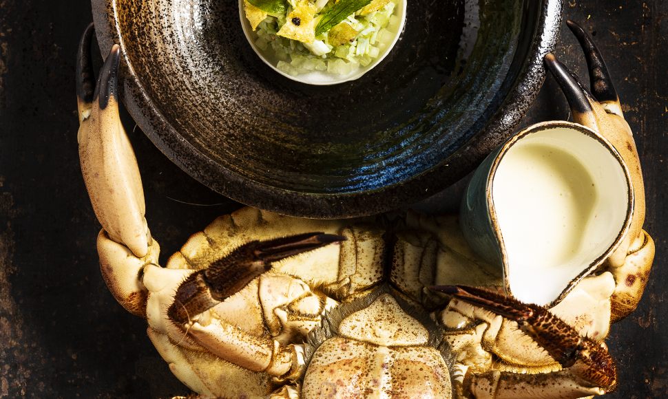 Effiloché de tourteau au concombre, verveine cristallisée, velours « ajo blanco »