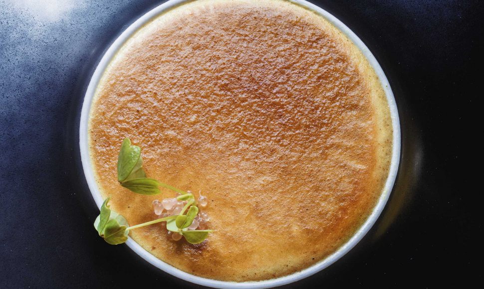 Un effiloché de tourteau accompagné d'un sabayon minute, citronné et parfumé au Kari Gosse, on y ajoute une espuma d'avocat pour une note végétale !