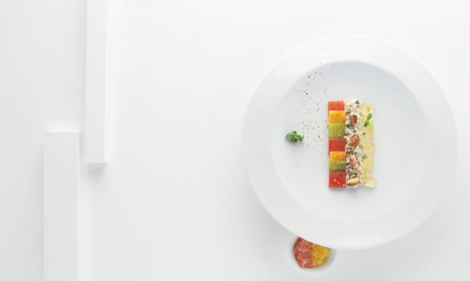 Effilochée de crabe peekytoe, gaspacho en gelée, granités de tomates heirloom