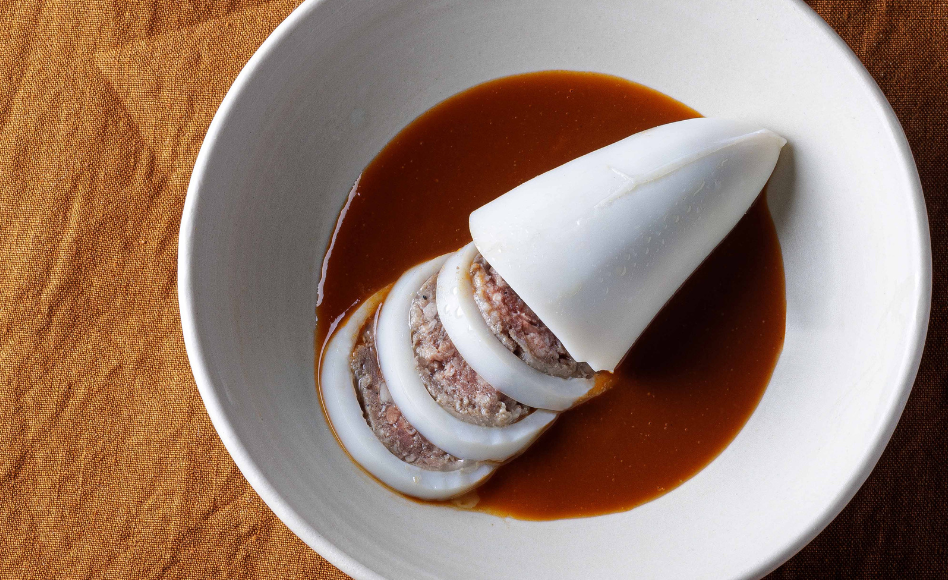 Encornets farcis "retour de chasse", sauce puttanesca