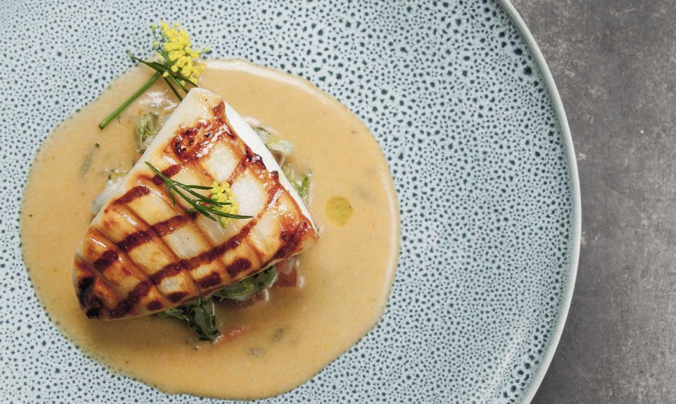 Encornets grillés à la romaine, aneth, condiment anchois-pistache
