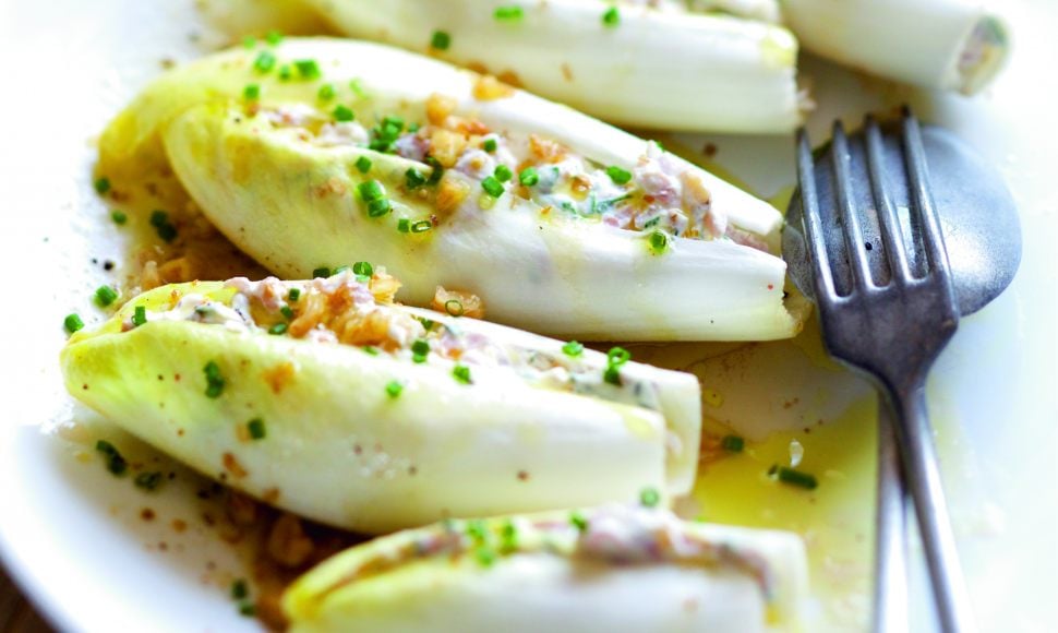 Coupez l'extrémité du trognon des endives et détachez les plus belles feuilles. Lavez-les et déposez-les sur un linge pour les sécher.