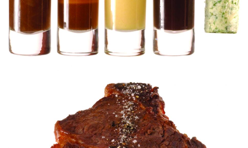 Entrecôte de charolais à la poêle, beurre maître d’hôtel, sauce béarnaise, sauce marchand de vin, sauce bercy, sauce bordelaise