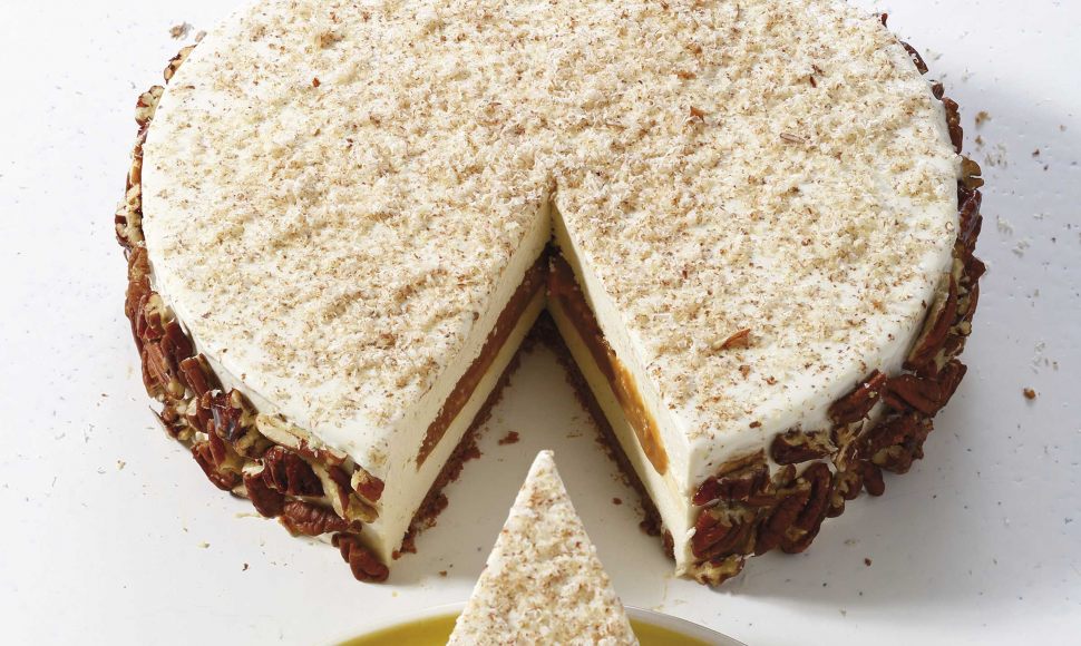 Un entremets composé d'un biscuit praliné-pécan, d'une bavaroise vanille et d'un coeur crémeux au caramel.