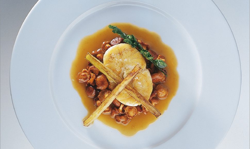 Epaisse darne de loup de méditerranée saisie à l’huile d’olive puis déglacée au jus de légumes à la grecque, poêlée de girolles et d’aubergines frites