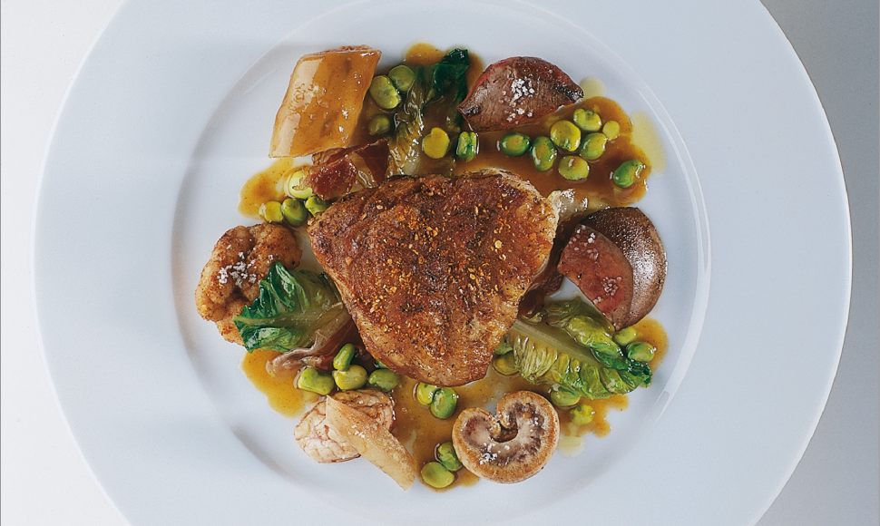 Epaule d’agneau de lait du pays basque finement incisée côté peau, à peine frottée d’ail, de thym et de piment d’espelette, dorée à la broche, tous les abats sautés, févettes et côtes de salade aux bouts de jambon gras