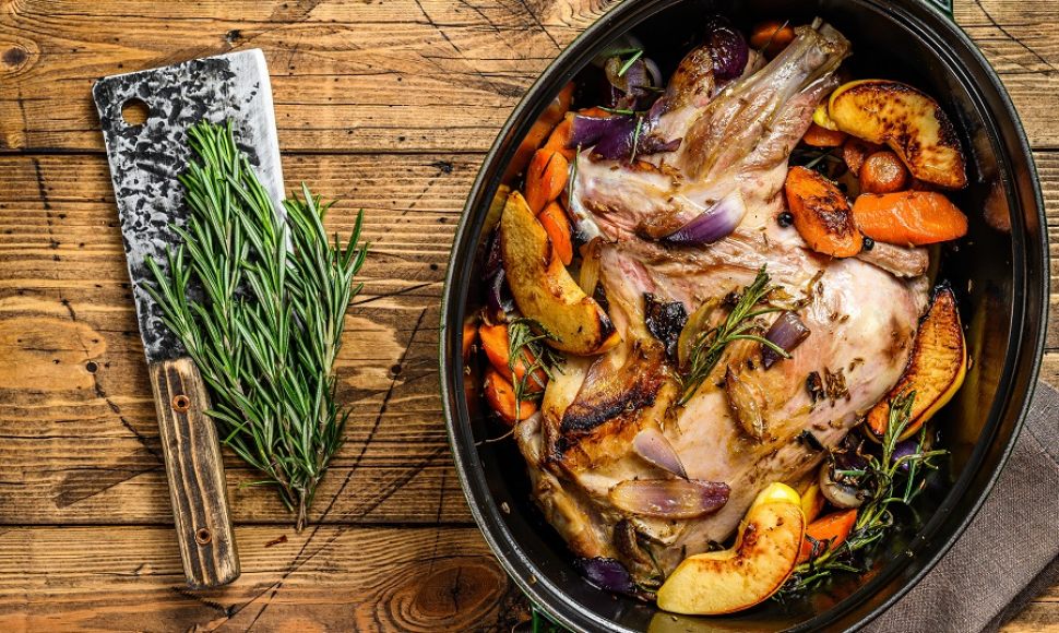 Ajoutez le romarin et le vin blanc ainsi que les pommes (facultatif). Couvrez la cocotte et enfournez-la pour 45 min à 1 h selon que vous voulez votre agneau rosé ou à point.