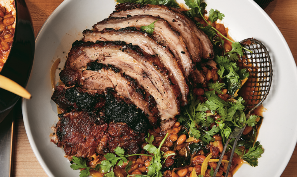 Epaule de porc frottée à la harissa, haricots blancs et blettes