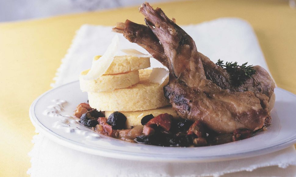 La viande mijote dans un mélange de vin blanc et de bouillon de poule avec lardons, oignons olives, tomates confites... à accompagner de polenta.