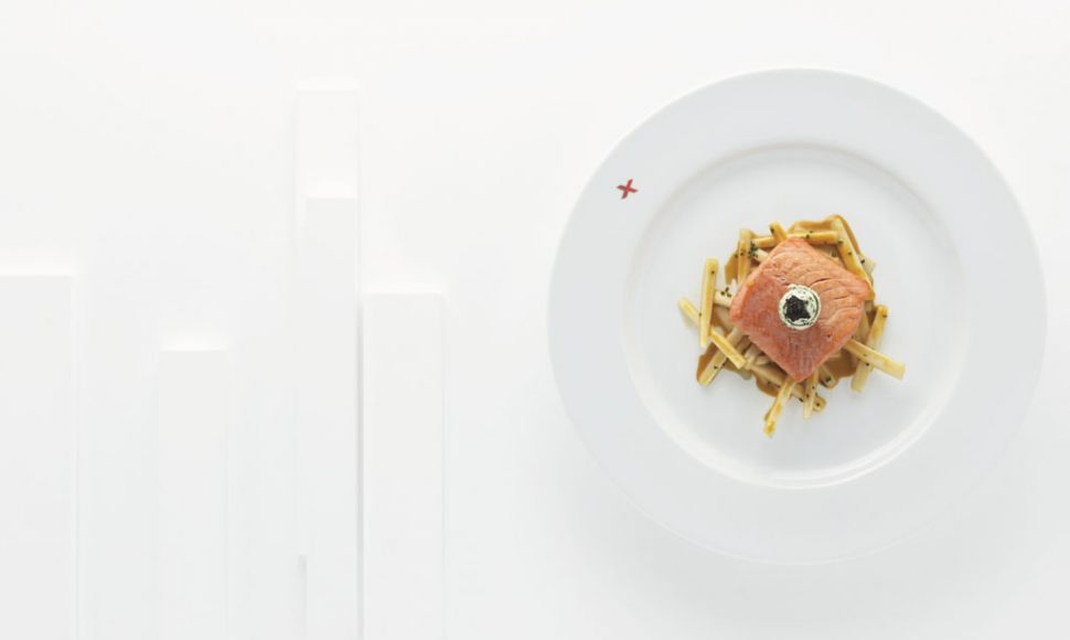 Escalope de saumon, endives liées à l’oursin, caviar osciètre et coquillette de beurre