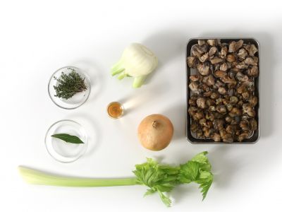 Mettre les escargots dans une grande casserole avec le bouillon de volaille, le vin blanc, l’oignon, le fenouil et le céleri, le thym et le laurier. Porter doucement à ébullition.
