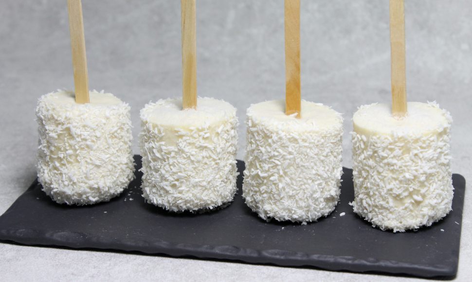 Avant de servir, faire chauffer un fond d'eau (2 à 3 cm) dans une grande casserole. Étaler la noix de coco râpée dans une assiette. Poser les tasses pendant 2 à 3 secondes dans l'eau chaude. Puis tirer doucement la pique pour démouler l'esquimau. Les rouler dans la noix de coco et les servir tout de suite.