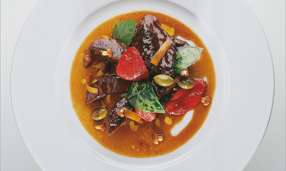 Tailler le tout en morceaux réguliers de belle grosseur et les assaisonner de fleur de sel. Faire chauffer un filet d’huile d’olive dans un récipient suffisamment grand pour contenir la totalité des viandes.