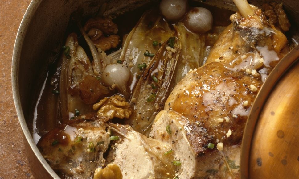 Hachez le foie et le cœur du faisan. Mélangez-les avec les noix, les raisins égouttés (gardez le cognac), la mie de pain et l’œuf. Assaisonnez cette farce.