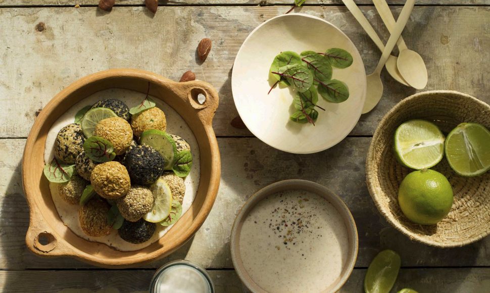 Des falafels légers aux pois chiche et okara, garnis d'herbes aromatiques et de sésame, accompagnés d'une douce sauce à l'amande et feuilles de red chard.