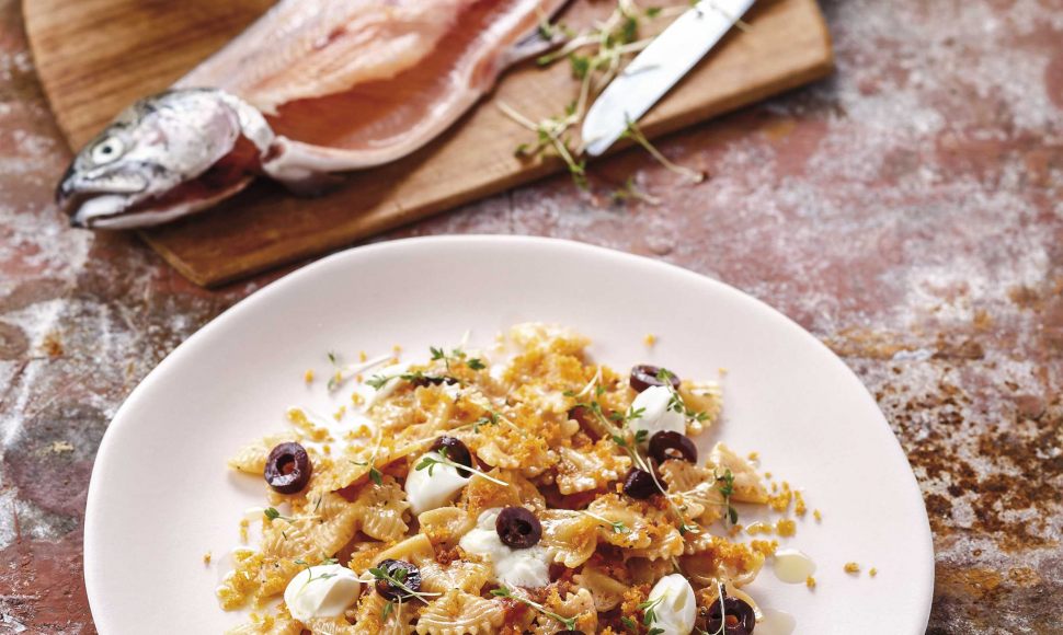 Des farfalle originaire d'Imperia au filet de truite et ricotta avec une sauce au poivre rose accompagnées de d'olives noires Taggiasches.