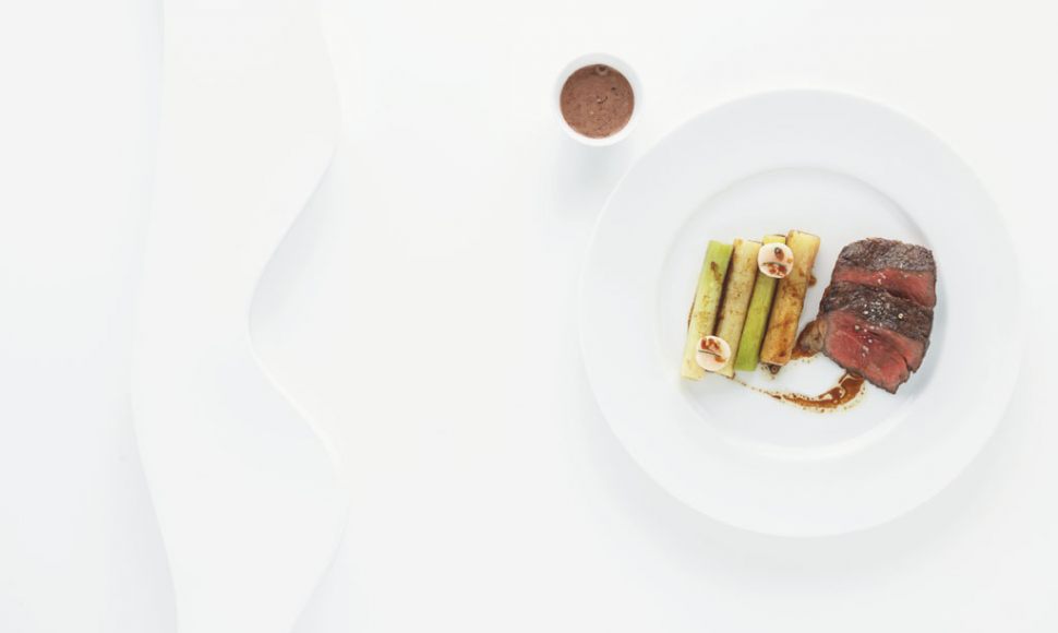Faux-filet de bœuf Simmental frotté de poivre noir sur la braise, poireaux/pommes de terre et moelle, condiment vin rouge