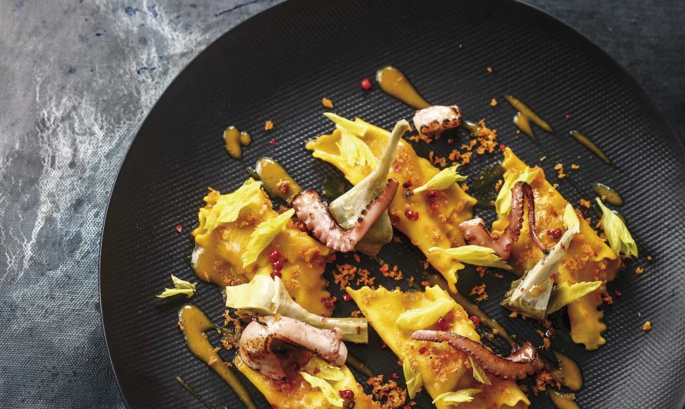 Un plat de fazzoletti, poulpe, artichauts et curry rouge au jus de citrons jaune et vert.
