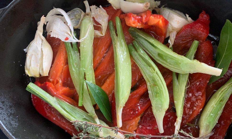 Faire colorer légèrement les fenouils coupés en deux à l’huile d’olive. Retirer, déposer les piquillos, puis les fenouils, les gousses d’ail écrasées, le vinaigre balsamique, fleur de sel et thym frais.
