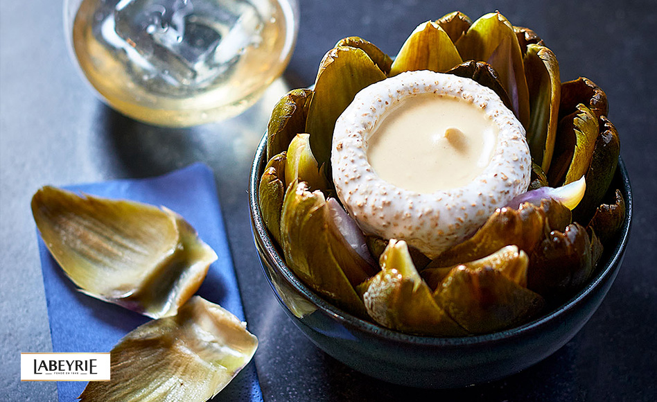 Pour servir, parez l'artichaut, et détachez les feuilles. Disposez les feuilles de l'artichaut tout autour d'un bol (comme pour en reconstituer la forme) et placez la mayonnaise au centre de l'assiette, en vous servant du cœur d'artichaut paré comme d'un récipient.