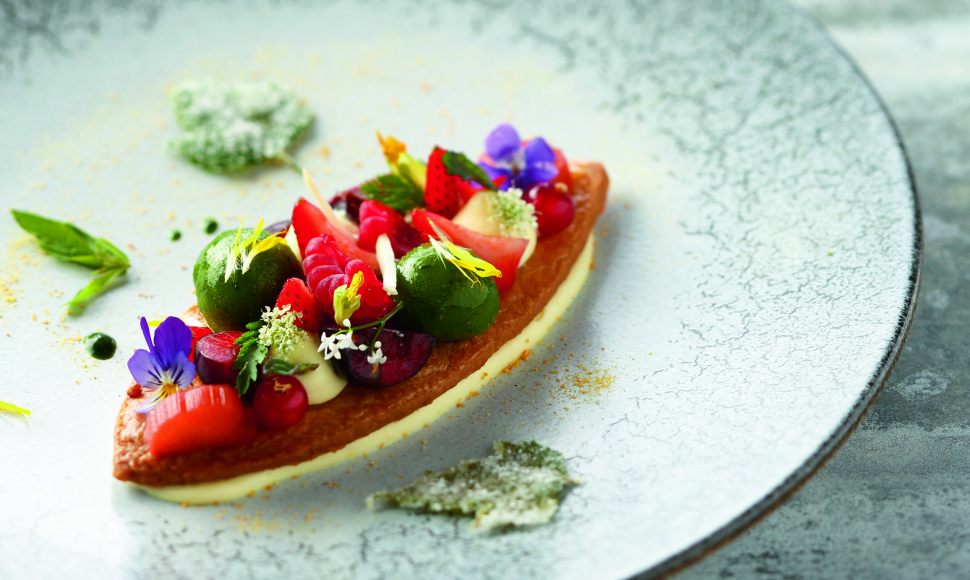 « J’aime travailler avec les saisons, surtout ici, à Saint-Bonnet où elles y sont très marquées. Tout dans le restaurant rappelle ce rythme saisonnier, la baie vitrée qui fait renter la nature à l’intérieur de la maison, les œuvres de Jean-Luc Lacombe, artiste peintre, la vaisselle qui prend à chaque saison une couleur différente. J’ai voulu réaliser un dessert sur une base de sablé aux fleurs, qui puisse être le reflet de chaque saison, avec ses fleurs, ses herbes, ses fruits, ses couleurs, et me rapprocher des œuvres de Jean-Luc. »