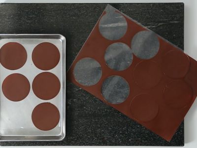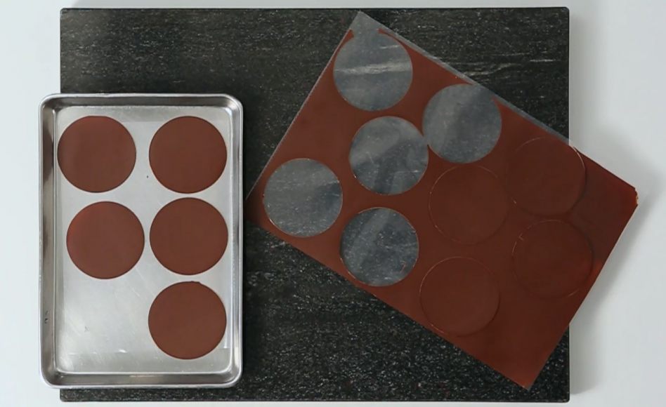 Déposer une feuille de papier guitare sur un marbre. Étaler une très fine couche (2 mm environ) de chocolat tablé sur cette feuille. Quand le chocolat commence à cristalliser, détailler les formes nécessaires pour la recette avec un emporte-pièce au format voulu. Recouvrir d'une feuille guitare puis d'une plaque afin que les formes de chocolat restent bien plates jusqu’à la fin de la cristallisation. Retirer la feuille de papier guitare. Avec une spatule, détacher les feuilles de chocolat et les déposer au fur et à mesure sur une plaque. Les réserver à 16°C.