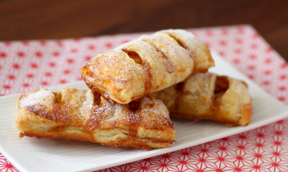 Préchauffez le four à 180°C. Etalez la pâte feuilletée sur le plan de travail et coupez les bords arrondis pour former un carré, que vous diviserez ensuite en quatre. Sur chaque partie, déposez un peu de caramel au beurre salé.