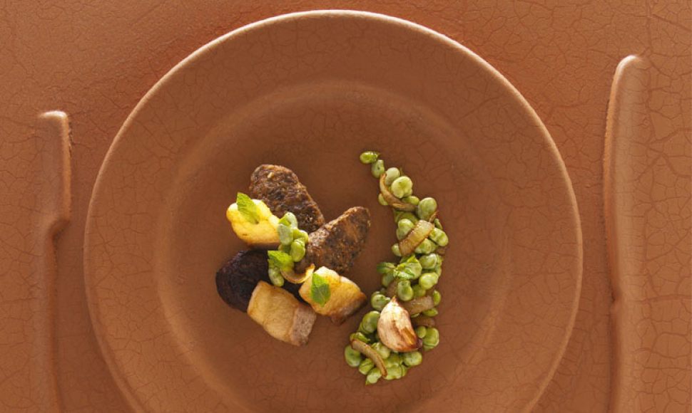 Nous avons aimé l’association des charcuteries et des fèves. Mais nous avons modifié la cuisson à l’étouffée des « Faves ofegades » (ofegat en catalan,veut dire étouffé) afin de préserver les fèves.