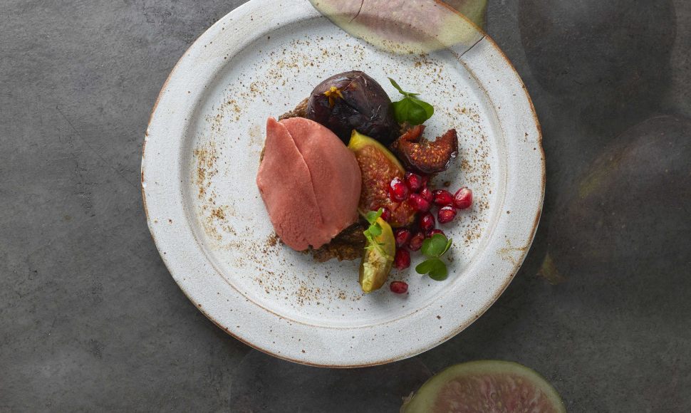 Figue en papillote, grenade et feuille de figuier givrée, condiment de seigle épicé