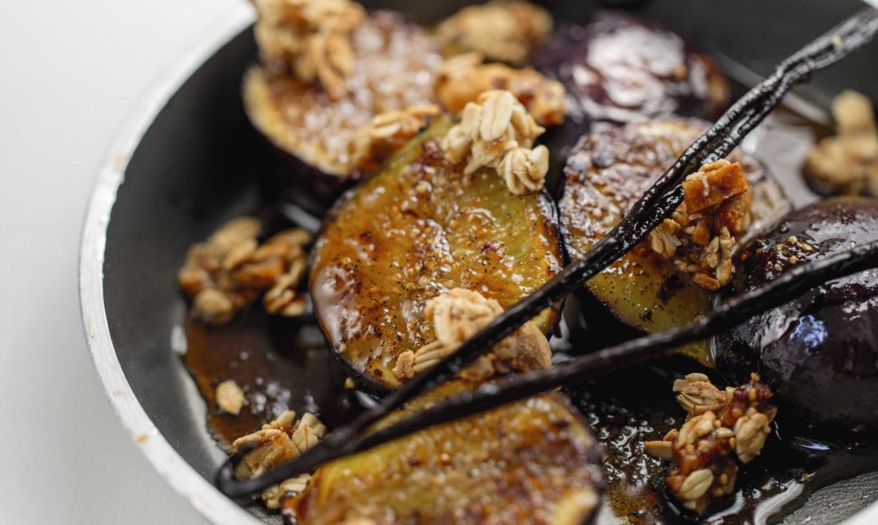 Dans une poêle, faites fondre le beurre avec les grains de vanille puis colorez les figues sur toutes les faces, en commençant par le côté plat. Éteignez le feu, ajoutez le sirop d’érable et recouvrez les figues du jus. Réservez à température ambiante.