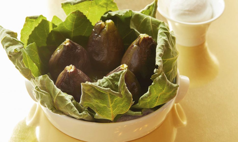 Préchauffez le four à 200 °C (th. 7). Rincez les figues sous l’eau, retirez la pointe à l’aide d’un couteau et faites une incision en croix sur le dessus de chacune. Déposez une feuille de figuier dans un plat à gratin, placez 4 figues dessus et versez un filet de miel sur chacune. Réitérez l’opération pour les 3 autres feuilles de figuier et les 12 figues restantes. Faites cuire 10 min au four, puis laissez tiédir.